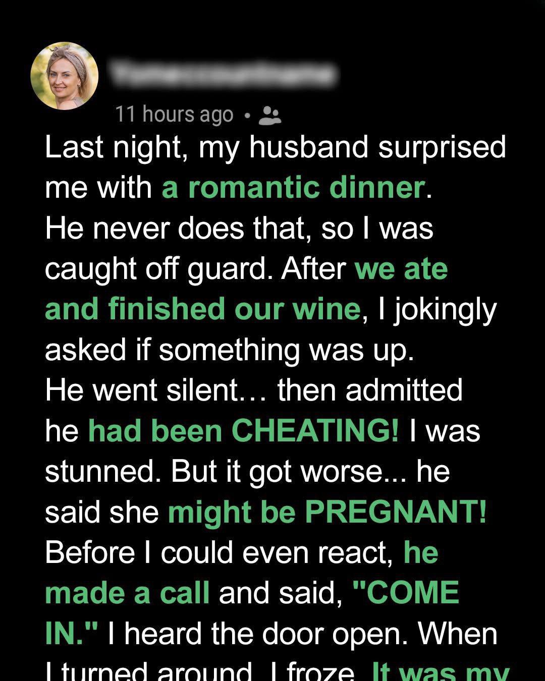 My heart dropped. Before I could even process it, he delivered another blow: she was pregnant. With twins. The dinner, the effort, the forced smiles—it all became clear. He wasn’t celebrating us. He was trying to soften me before destroying my world. And then came the cruelest twist of all. He picked up his phone, muttered a few words, and the door creaked open. I turned, and there stood my sister. She was the woman.