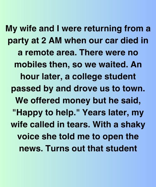 “Open the news,” she whispered.I did. And there he was — the same young man who once gave us a ride. Now no longer a student, but a doctor. His photograph filled the screen under the headline: