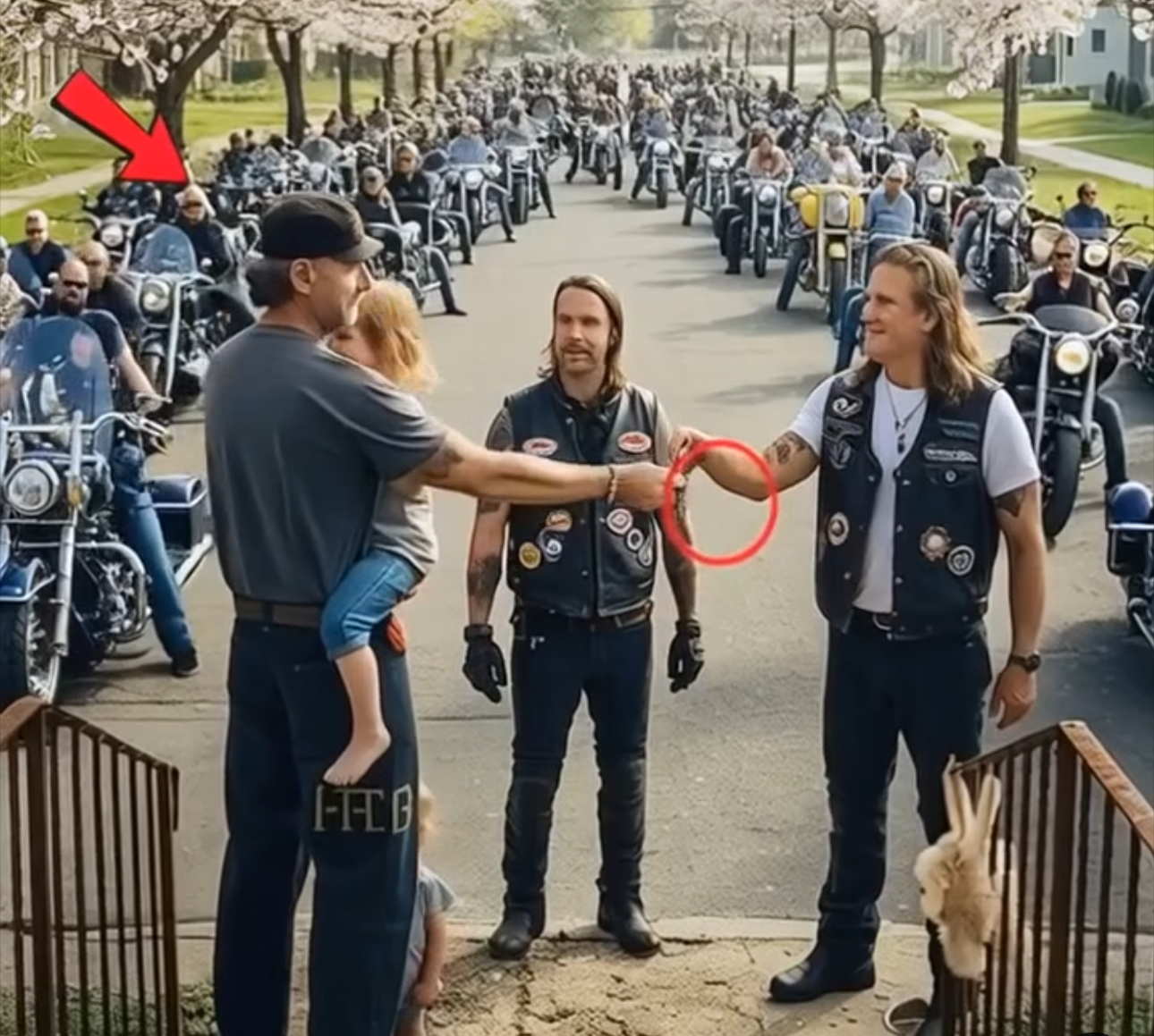 A few nights later, Adam sat at home, unpaid bills stacked on the table, when he heard it—the low rumble of engines. At first faint, then louder, until the street outside shook. Forty motorcycles lined up along the curb, chrome glinting under the dawn light. Adam froze, shielding Lily behind him.