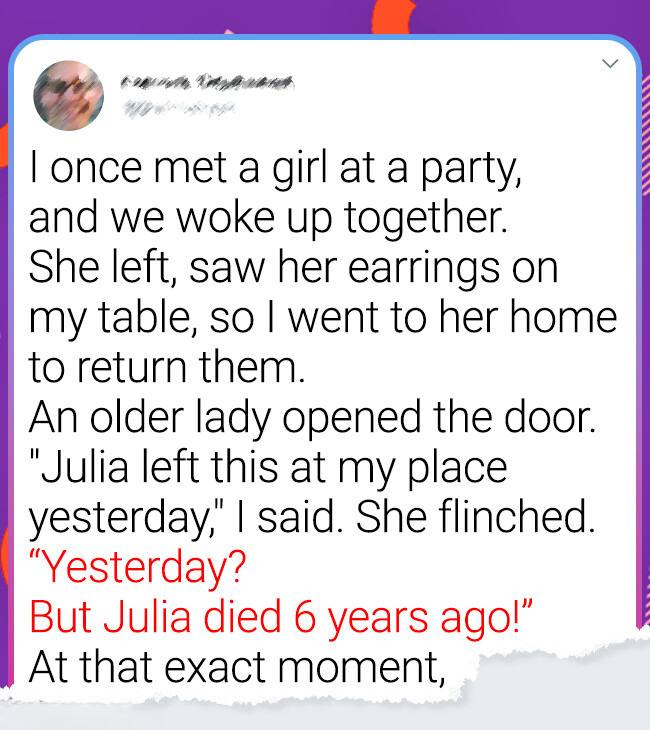 When he knocked on the door, an older woman answered. He politely explained, “Julia left this at my place yesterday.” To his surprise, the woman flinched, her expression instantly changing. She looked at him as though he had just spoken something impossible. Then, with trembling lips, she whispered, “Yesterday? But Julia died six years ago.”