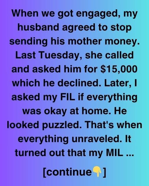 When we got engaged, my husband agreed to stop sending his mother money. Last Tuesday, she called and asked him for $15,000 which he declined. Later, I asked my FIL if everything was okay at home.