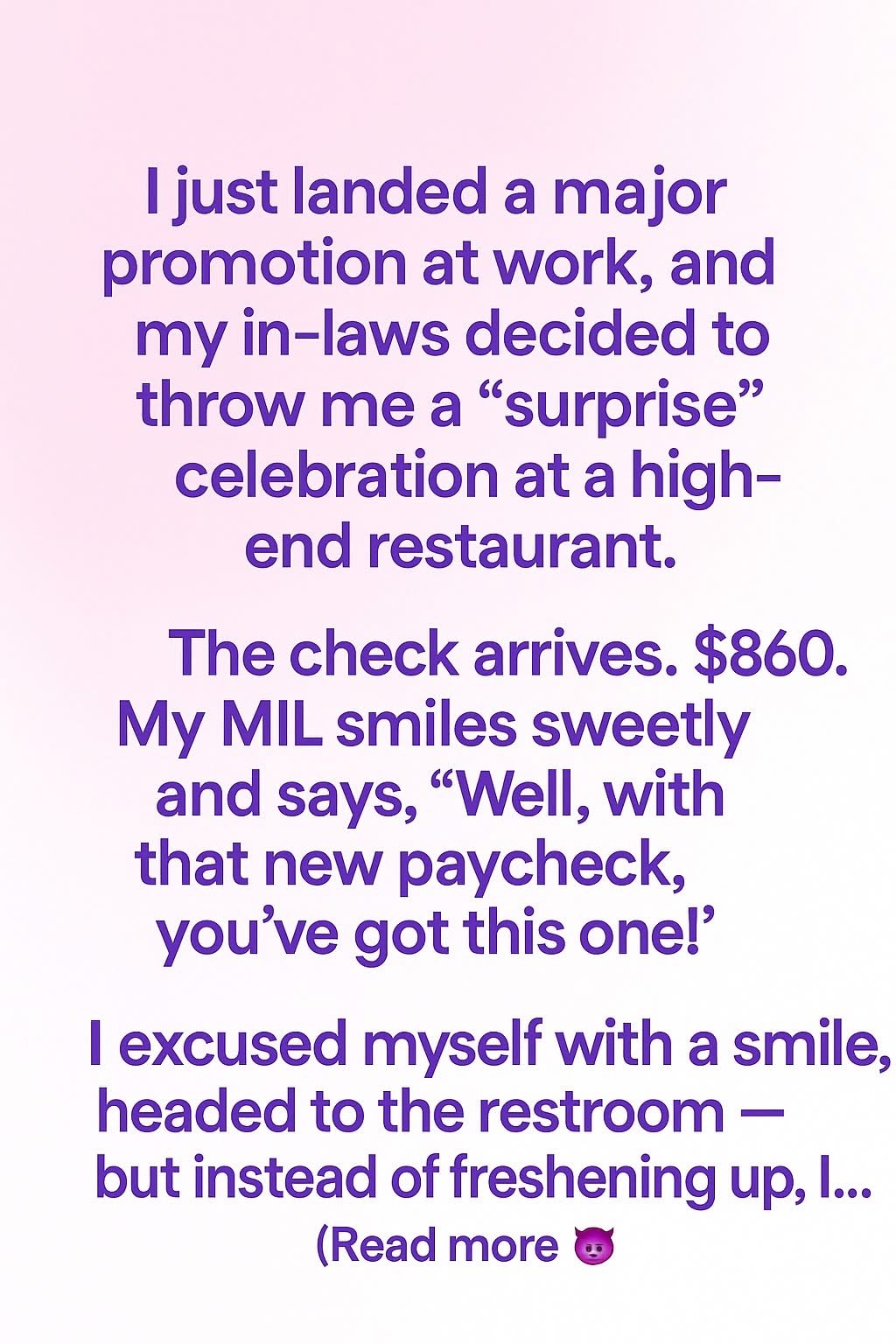 I just landed a major promotion at work, and my in-laws decided to throw me a “surprise” celebration at a high-end restaurant. It felt thoughtful at first, and I appreciated the gesture—until the check arrived. The total was $860. My mother-in-law smiled and said, “Well, with that new paycheck, you’ve got this one!” The table chuckled lightly, but I felt uneasy. I had never agreed to host the event; I had simply been invited to it.