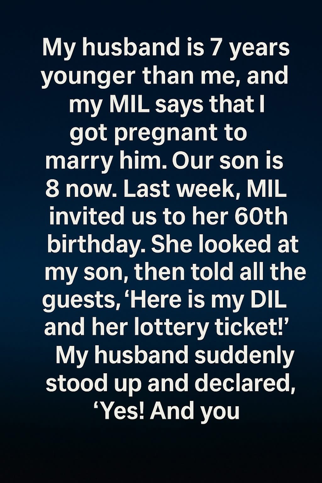My husband is 7 years younger than me, and my MIL says that I got pregnant to marry him. Our son is 8 now. Last week, MIL invited us to her 60th birthday. She looked at my son, then told all the guests, “Here is my DIL and her lottery ticket!” My husband suddenly stood…