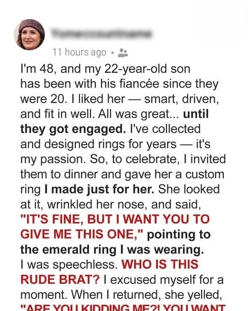 When my son Brandon got engaged, my heart was full. I adored his fiancée, Alice, and looked forward to welcoming her into our family. To celebrate their engagement, I decided to craft a special ring for her — something created with love, just as I had done for all the meaningful moments in our family….