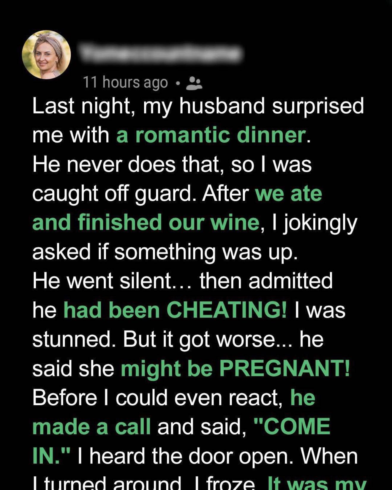 My heart dropped. Before I could even process it, he delivered another blow: she was pregnant. With twins. The dinner, the effort, the forced smiles—it all became clear. He wasn’t celebrating us. He was trying to soften me before destroying my world. And then came the cruelest twist of all. He picked up his phone, muttered a few words, and the door creaked open. I turned, and there stood my sister. She was the woman.