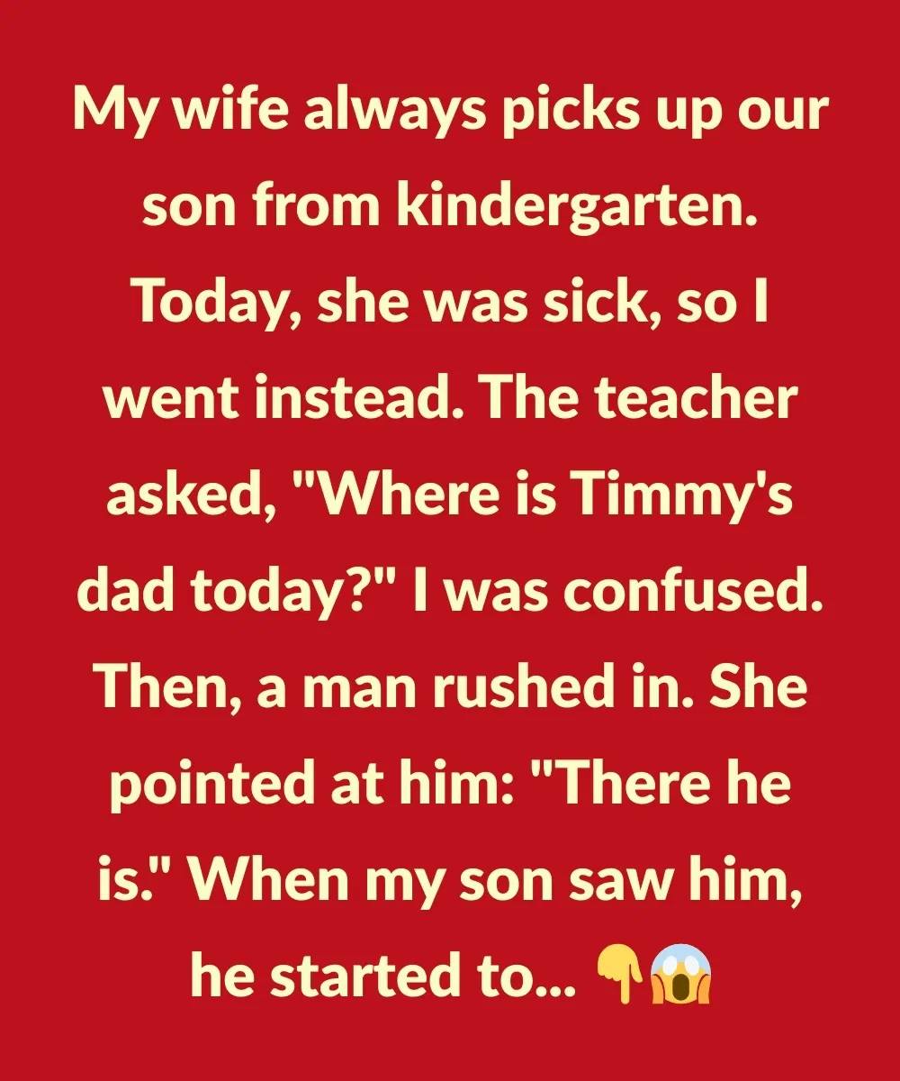 My wife always picks up our son from kindergarten. Today, she was sick, so I went instead. The teacher asked, “Where is Timmy’s dad today?” I was confused.