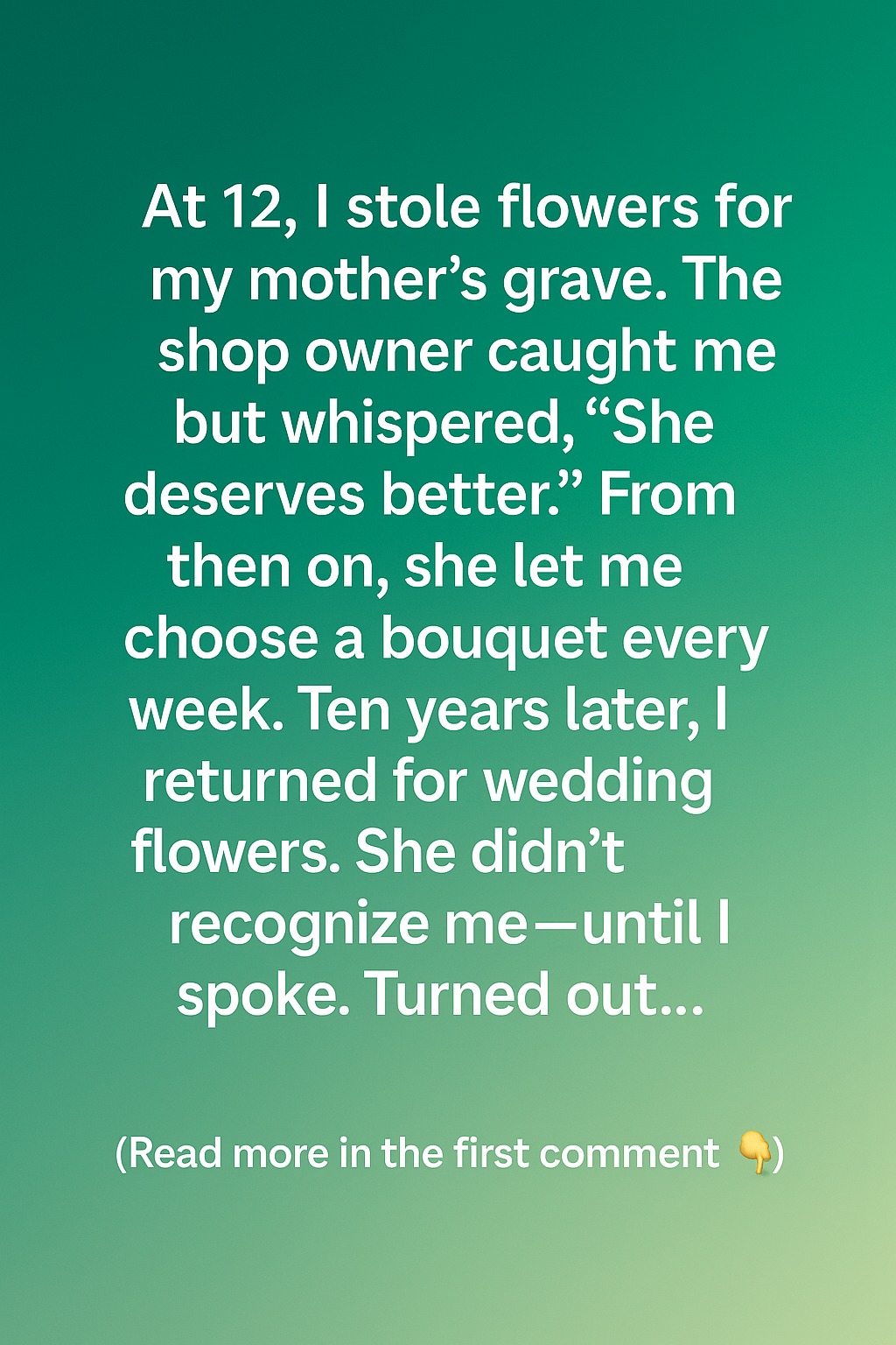 Ten years passed. My life changed—I finished school, started working, and slowly healed. When it came time to order flowers for my wedding, there was only one place I wanted to go. I walked into her shop, now renovated and blooming in every corner. The owner didn’t recognize me at first. But when I thanked her for her kindness from years ago, she paused, searching my face. Then, the moment I spoke again, her eyes welled with tears and she reached for my hands.