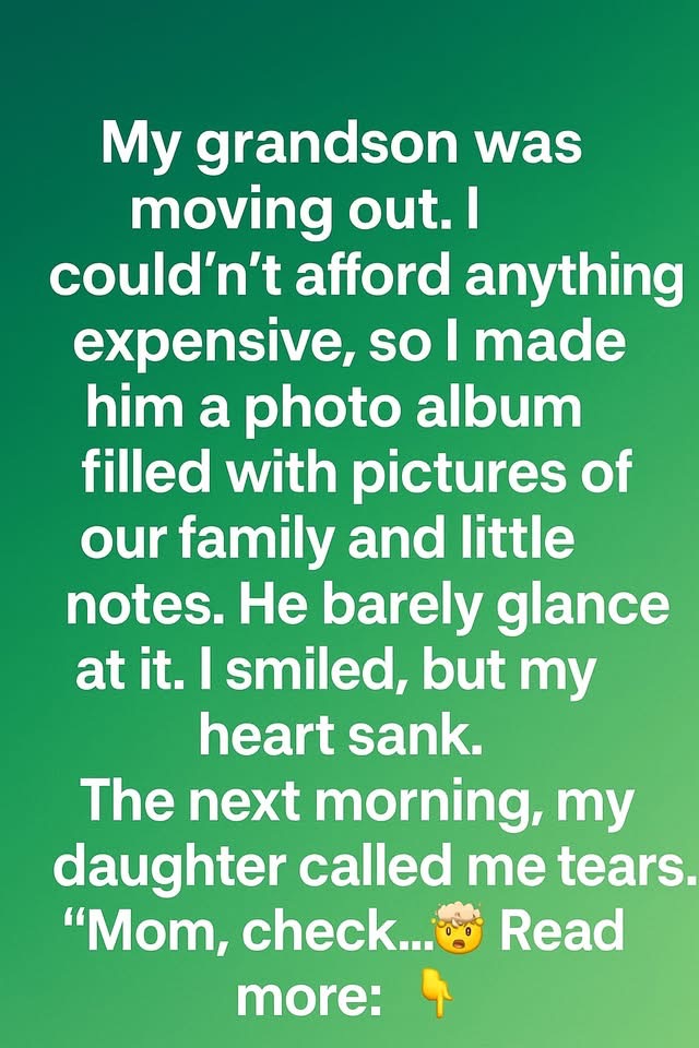 My grandson was moving out, and though I wished I could give him something grand, my budget was tight. Instead, I created a heartfelt photo album filled with family pictures and handwritten notes capturing moments we cherished. When I handed it to him, he barely glanced at it before returning to packing. I smiled so…