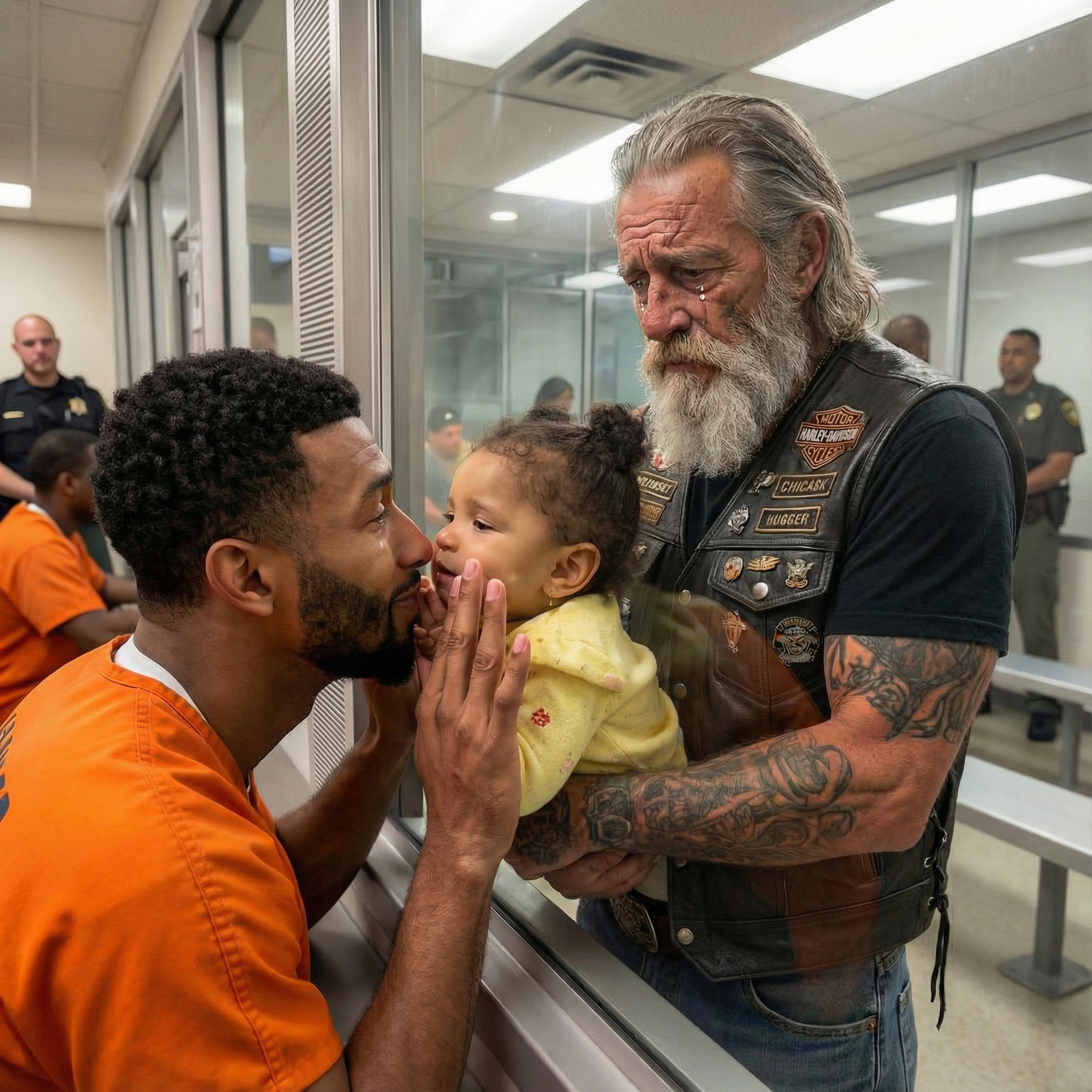 When Marcus walked into the visitation room, he didn’t find his attorney. He found an older man in a worn leather vest, long gray beard, and gentle eyes—holding a tiny baby bundled in a pastel blanket.