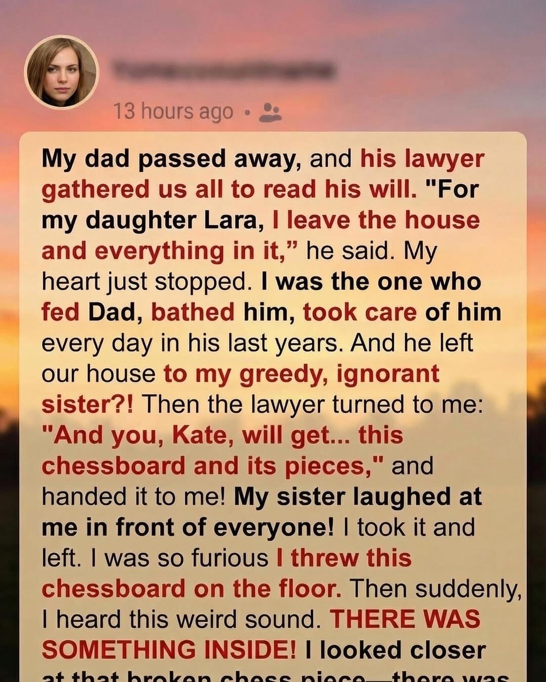 My dad passed away, and his lawyer gathered us all to read his will. “For my daughter Lara, I leave the house and everything in it,” he said. My heart just stopped. I was the one who fed Dad, bathed him, took care of him every day in his last years. And he left our house to my greedy, ignorant sister?! Then the lawyer turned to me: “And you, Kate, will get… this chessboard and its pieces,” and handed it to me! My sister laughed at me in front of everyone! I took it and left. I was so furious I threw this chessboard on the floor. Then suddenly, I heard this weird sound. THERE WAS SOMETHING INSIDE! I looked closer at that broken chess piece—there was a small compartment tucked inside. My anger faded for a moment as curiosity took over. Why would Dad leave me something like this? What secret did he hide inside a simple wooden chess set?