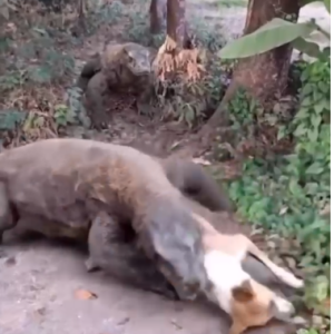 In a terrifying scene straight out of the wild, a massive monitor lizard lunges at a helpless dog on a quiet path surrounded by trees. The reptile…