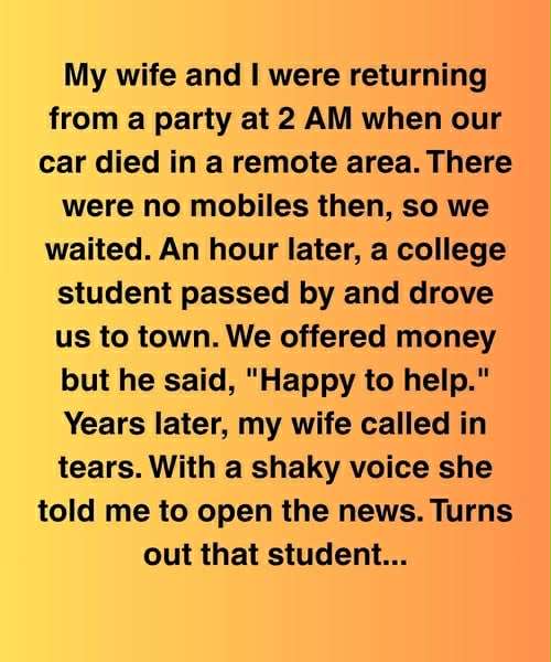 Our car broke down on a deserted stretch of road, hours away from any help, and the clock crept past 2 a.m. Just as hope was fading, a stranger appeared—a passing college student offering a ride that, years later, would reveal itself as a pivotal moment in all our lives.