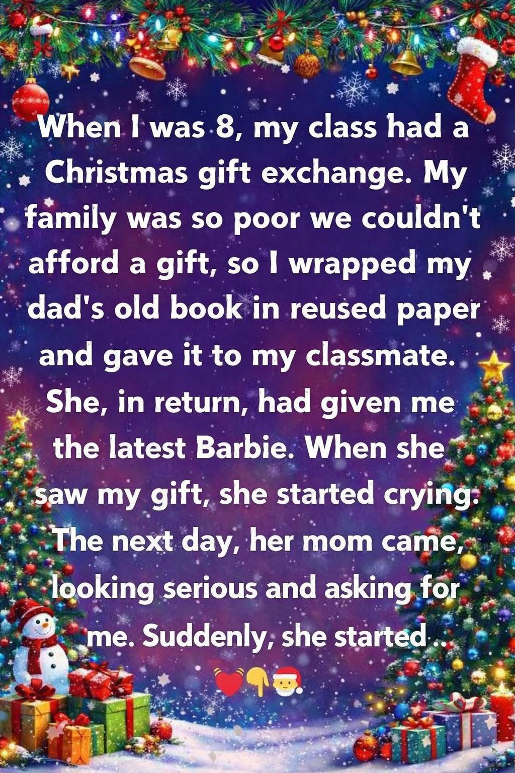 When I was 8, my class had a Christmas gift exchange. My family couldn’t afford a gift, so I wrapped one of my dad’s old books and gave it to a classmate. In return, she gave me the latest Barbie. When she saw my gift, she started crying.