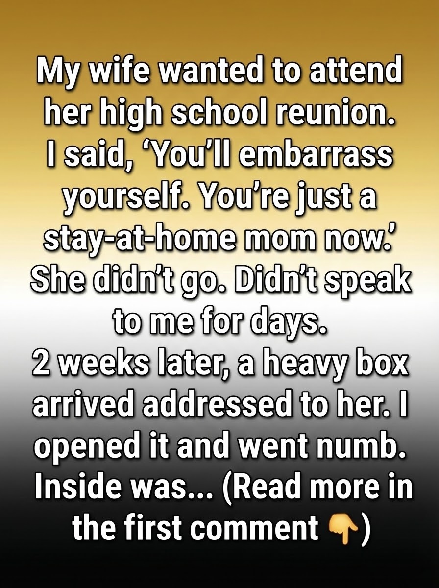 The night my wife mentioned her high school reunion, I barely looked up from my phone. She stood in the kitchen, holding the invitation with a hopeful smile I didn’t fully register until it was gone. I told her, carelessly and arrogantly, that it might be awkward for her now—that she was “just” a stay-at-home mom and might feel out of place. The words landed heavier than I intended, but I didn’t stop them. She didn’t argue. She simply nodded, folded the invitation, and placed it in a drawer. In the days that followed, our house felt unusually quiet. She moved through routines with efficiency but little warmth, and we spoke only when necessary. I told myself it would pass, not realizing how deeply I had wounded her.