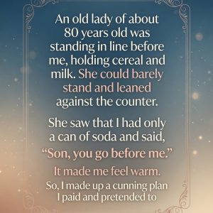 An elderly woman stood in line at a grocery store ahead of me, holding only a small box of cereal and a carton of milk. She looked…