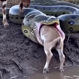 A dramatic wildlife moment has taken social media by storm after images surfaced of a goat confronting a massive snake at the edge of a muddy riverbank….